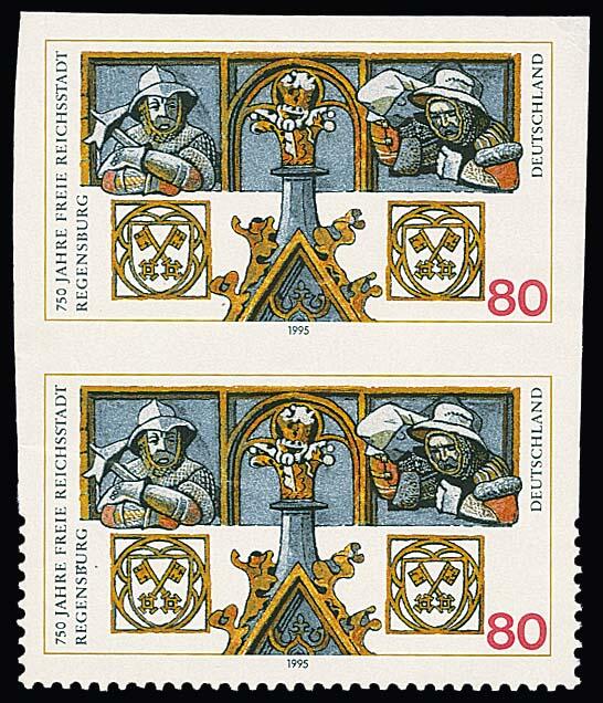 | Zusatzinformationen und Suchstichworte: | Rauhut & Kruschel - 219. Auktion 29. Juli 2023 Los 4904 Bundesrepublik Deutschland 80 Pfg. Regensburg im postfrischen senkrechten Paar (Knitterspuren, obere Marke kleine Gummifehlstelle nur im Aussenrand ausserhalb des Markenbildes), obere Marke vierseitig ungezähnt, untere oben und seitlich zur Hälfte ungezähnt, selten Ausruf 400,00 EUR |