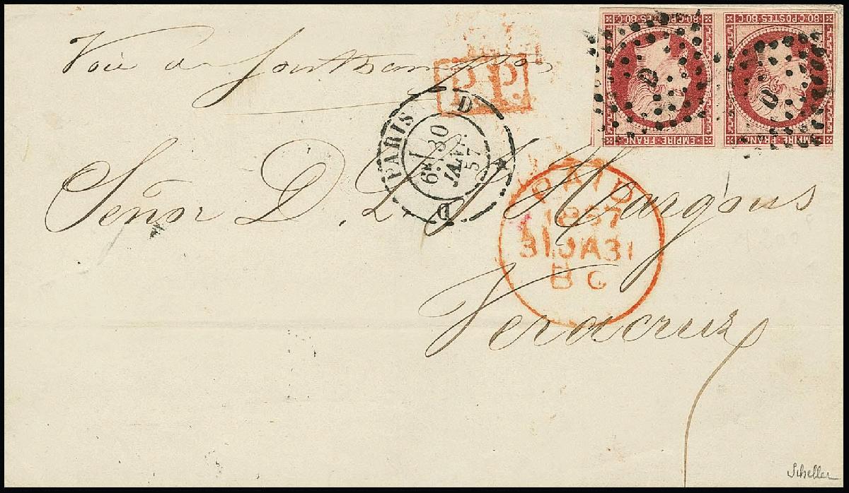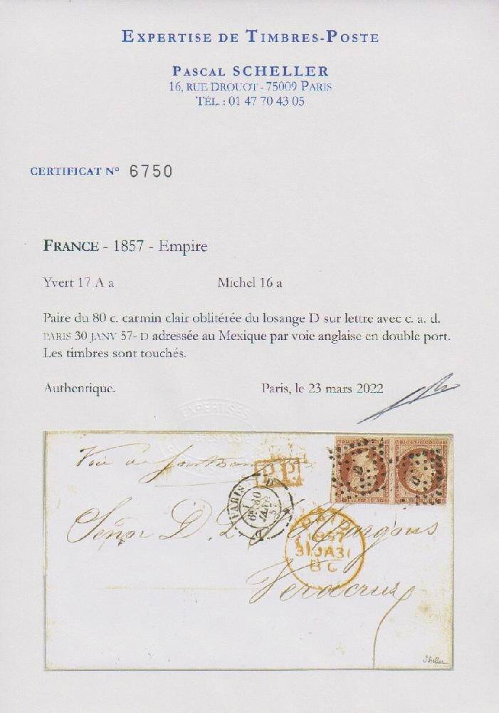 | Zusatzinformationen und Suchstichworte: | Rauhut & Kruschel - 219. Auktion 29. Juli 2023 Los 4969 Frankreich 80 C. karmin, waagerechtes Paar, etwas berührt, auf Faltbrief der 2. Gewichtsstufe 1857 von Paris via Southampton nach Veracruz, Mexiko. Ausruf 650,00 EUR |