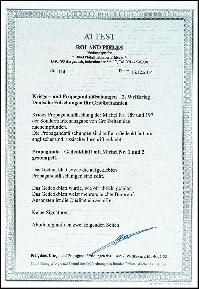 | Zusatzinformationen und Suchstichworte: | Dr. Reinhard Fischer 192. Auktion 19. - 20. Mai 2023 Los 1999 Kriegs und Propagandafälschungen II. WK 1/2 d Silberjubiläum und 1 1/2 d Krönung, je mit Kopf Stalins, tadellos gestempelt auf komplettem Gedenkblatt mit englischer und russischer Inschrift. Fotoattest Pieles BPP: "Das Gedenkblatt sowie die aufgeklebten Propagandafälschungen sind echt. Das Gedenkblatt wurde, wie oft üblich, gefaltet. Das Gedenkblatt weist mehrere leichte Büge auf. Ansonsten ist die Qualität einwandfrei." Ausruf 250,00 EUR |