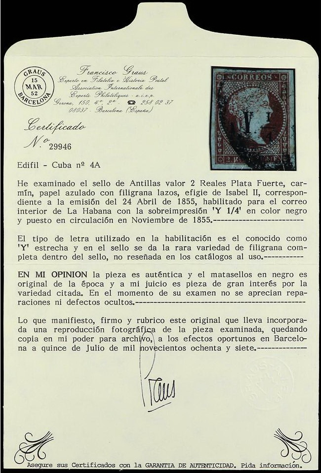 | Zusatzinformationen und Suchstichworte: | Soler y Llach - 788. Auktion 4. - 5. Juli 2023 Los 4087 Spanien ESPAÑA. Y 1/4 s. 2 reales carmín, tipo I. Filigrana desplazada quedando entera en el sello. RARÍSIMO. Cert. GRAUS. Ed.4fd. Cat. 1.650€ Ausruf 200,00 EUR |