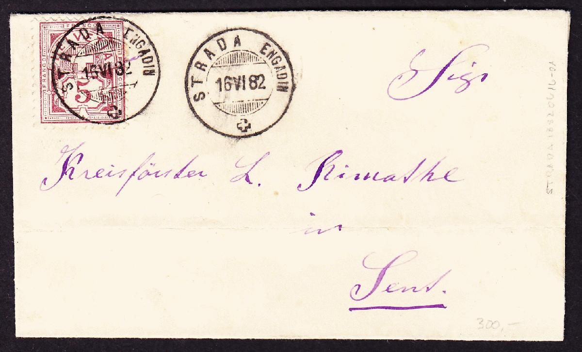 | Zusatzinformationen und Suchstichworte: | Weggler Shop Los 0000100292 Schweiz, Kanton Graubünden 1882 kleiner Faltbrief (waagerechter Registraturbug) nach Sent. Gestempelt STRADA ENGADIN auf 5 Rp hellbraun-lila weisses Papier. Festpreis 230,00 CHF |