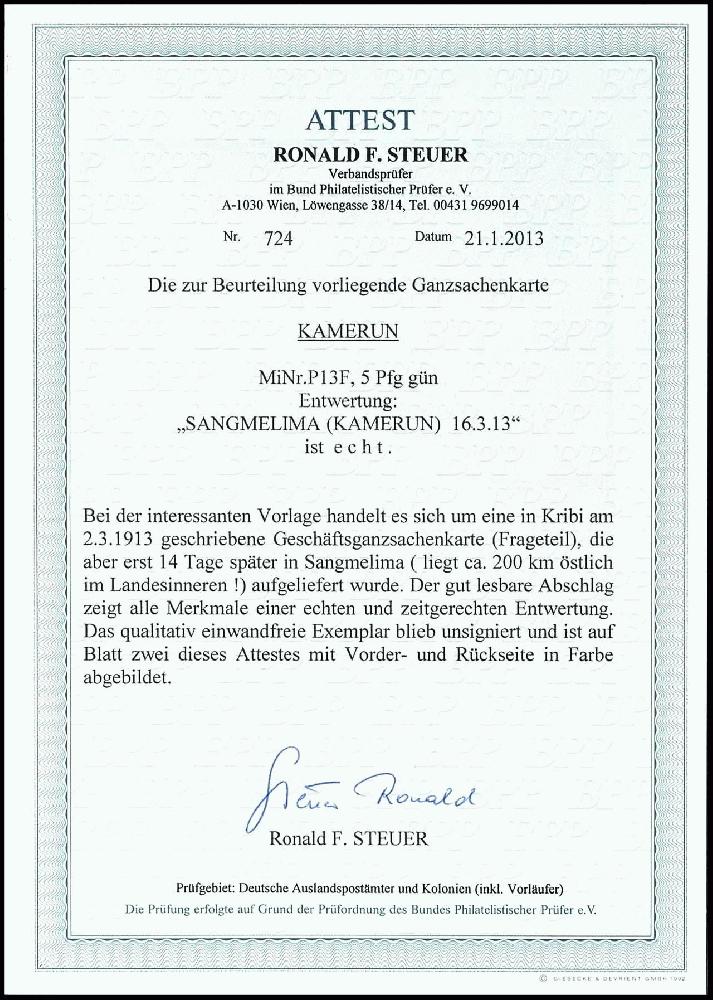 | Zusatzinformationen und Suchstichworte: | Dr. Reinhard Fischer 192. Auktion 19. - 20. Mai 2023 Los 1166 Deutsche Kolonien Kamerun SANGMELIMA 16.3.16, klar auf bedarfsmäßiger Geschäftsganzsache 5 Pfennig Kaiseryacht (Frageteil!) geschrieben 14 Tage vorher in KRIBI 200 km im Landesinneren, Attest Steuer BPP "qualitativ einwandfrei", die aktuelle Arge Bewertung ist nicht ganz nachvollziehbar Ausruf 200,00 EUR |