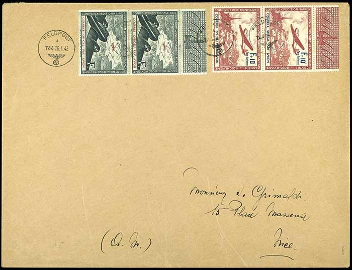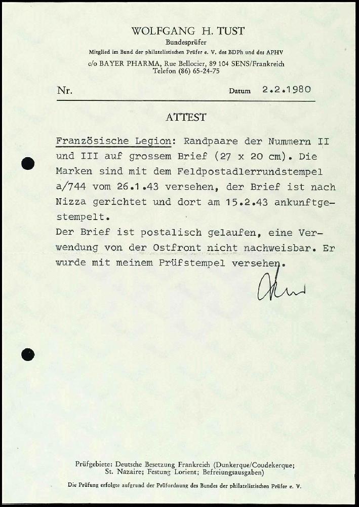 | Zusatzinformationen und Suchstichworte: | Dr. Reinhard Fischer 192. Auktion 19. - 20. Mai 2023 Los 1771 Deutsche Besetzung II. WK Französische Legion Flugpostvignetten, je senkrechtes Oberrandpaar auf Feldpostbrief mit Feldpost-Adler-Rundstempel a/744 vom 26.1.43 nach Nizza (Ank.Stpl. 15.2.43), geprüft Tust BPP und Attest Tust BPP: "Der Brief ist postalisch gelaufen, eine Verwendung von der Ostfront nicht nachweisbar." Ausruf 500,00 EUR |