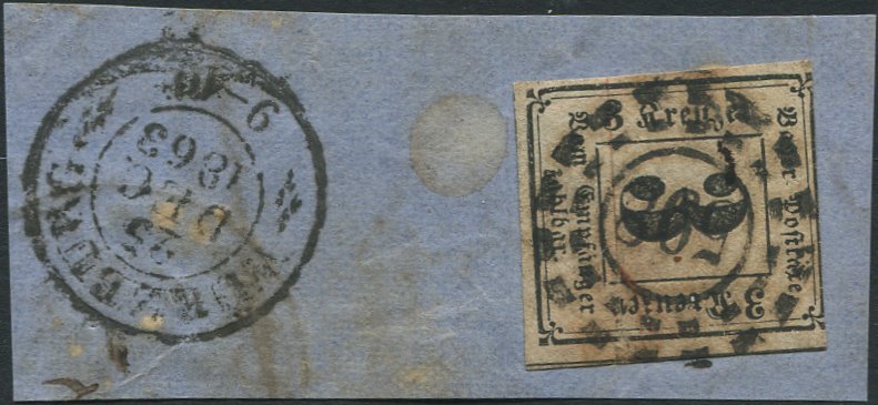 | Zusatzinformationen und Suchstichworte: | 110. Briefmarken Lenz Auktion 21. - 26. April 2023 Los 2859 Altdeutschland Bayern 1862, 1 Kr. schwarz, oben berührt, Seidenfaden rechts locker, zentrisch klarer OMR "598", daneben klar "WÜRZBURG-25.DEC.1863", Befund Sem BPP, Mi,400 Ausruf 55,00 EUR |