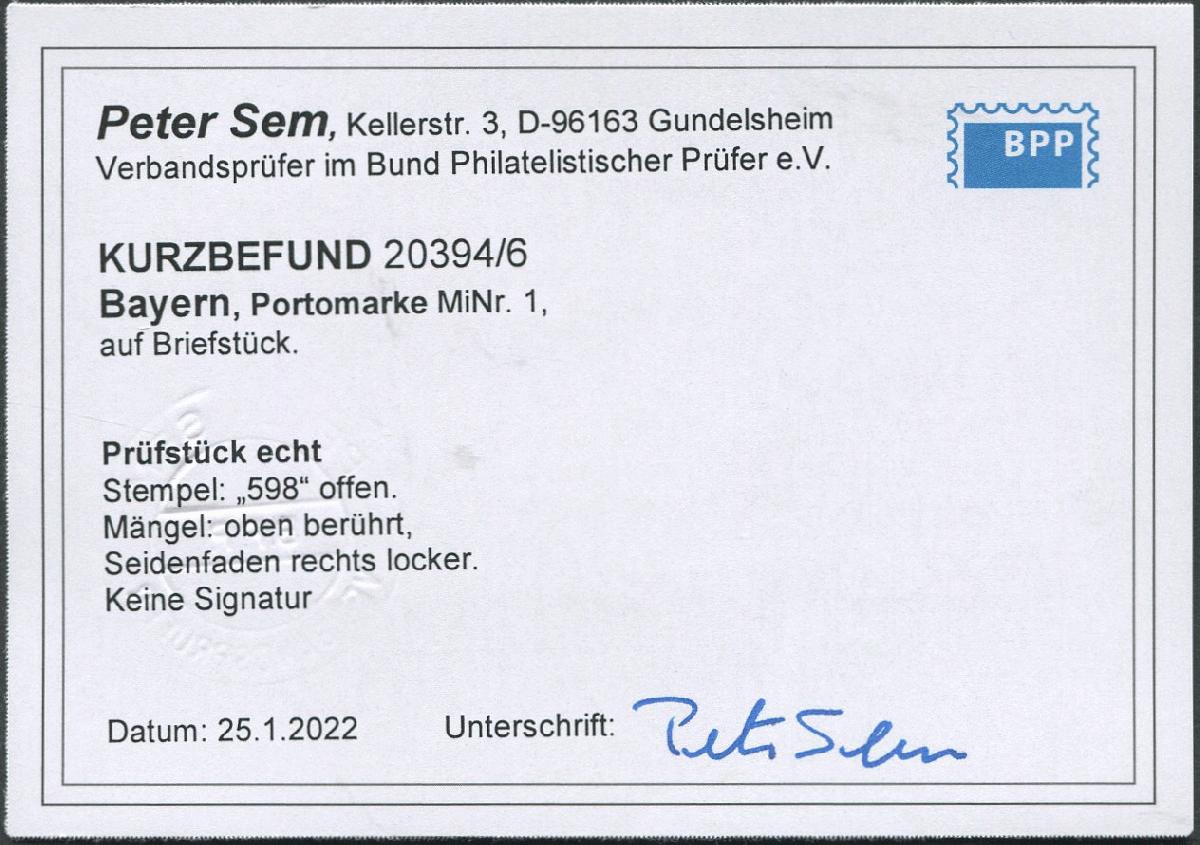| Prüfgebiet: | Altdeutschland Bayern Portomarken |