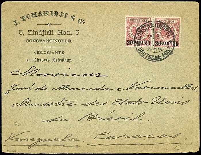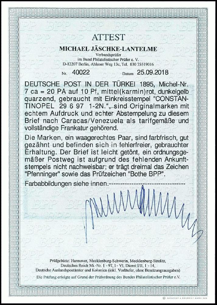 | Zusatzinformationen und Suchstichworte: | Dr. Reinhard Fischer 193. Auktion 21. - 22. Juli 2023 Los 2698 Deutsche Auslandspost Türkei 20 Para auf 10 Pfennig mittelkarminrot (dunkelgelb quarzend), waagerechtes Paar auf Brief von "Constantinopel 29 6 97" nach Caracas/Venezuela als portogerechte Frankatur, der ordnungsgemäße Postlauf kann aufgrund des fehlenden Ankunftsstempels laut Attest Jäschke-Lantelme BPP nicht nachgewiesen werden, Mi. für Brief 1.900.- / zwei lose Marken 800.- Ausruf 300,00 EUR |