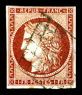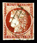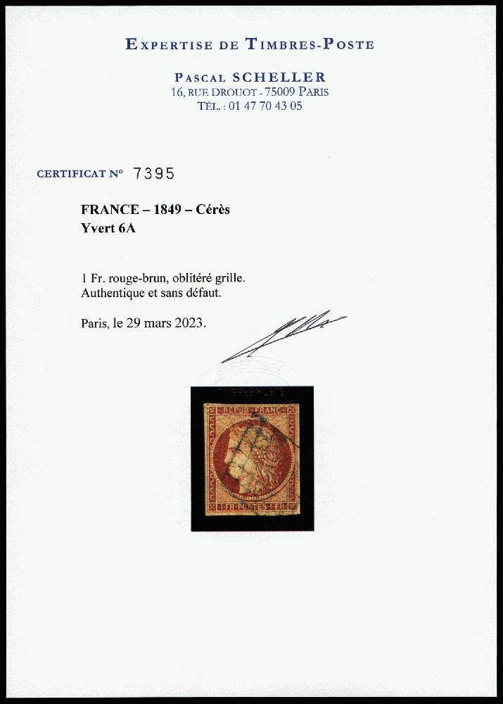 | Zusatzinformationen und Suchstichworte: | La Postale Philatélie 42. Auktion 7. Juli 2023 Los 74 Frankreich Cérès 1849 N°6A, 1F rouge-brun obl grille. SUPERBE. R. (signé Scheller/certificats) Qualité: Oblitéré Cote: 3200 euros Ausruf 1.000,00 EUR |