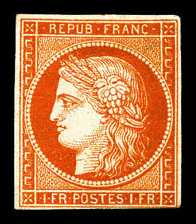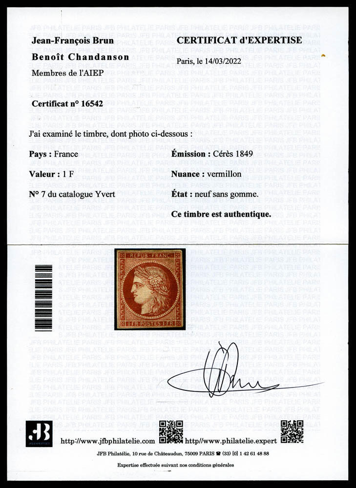 | Zusatzinformationen und Suchstichworte: | La Postale Philatélie 42. Auktion 7. Juli 2023 Los 78 Frankreich Cérès 1849 N°7, 1F vermillon, très belle nuance. SUPERBE. R.R.R. (signé Brun/certificat) Qualité: (*) Cote: 55000 euros Ausruf 16.000,00 EUR |