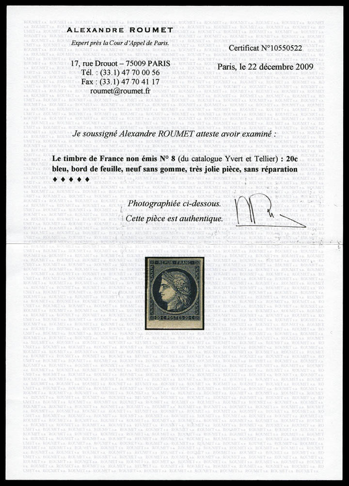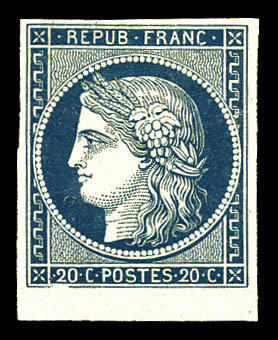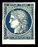| Zusatzinformationen und Suchstichworte: | La Postale Philatélie 42. Auktion 7. Juli 2023 Los 89 Frankreich Cérès 1849 N°8a, Non émis, 20c bleu foncé bdf, grande fraîcheur, R.R. SUP (certificats) Qualité: (*) Cote: 3400 euros Ausruf 1.600,00 EUR |