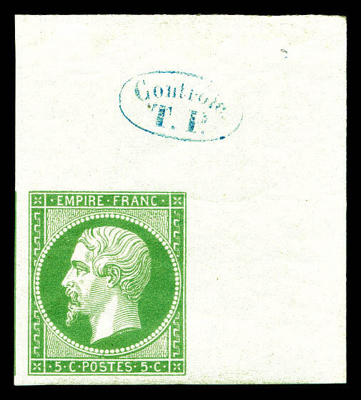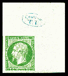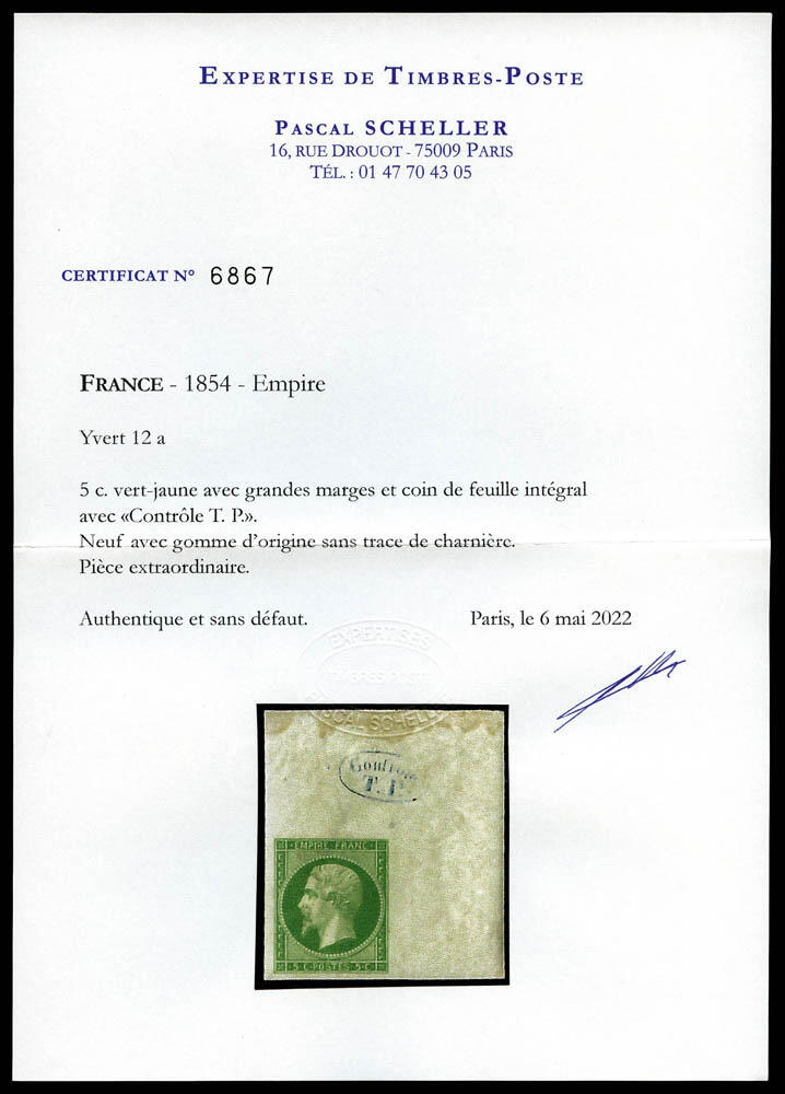 | Zusatzinformationen und Suchstichworte: | La Postale Philatélie 42. Auktion 7. Juli 2023 Los 126 Frankreich Empire ungezähnt 1853 N°12a, 5c vert-jaune nuance claire rare, grand coin de feuille avec griffe bleue 'CONTROLE TP' et filet d'un voisin. Pièce EXCEPTIONNELLE. SUP (signé/certificats) Qualité: ** Ausruf 3.900,00 EUR |
