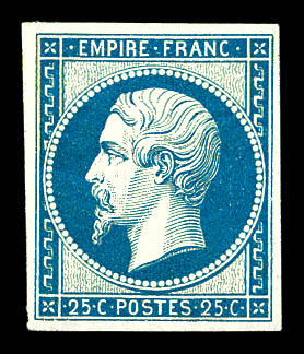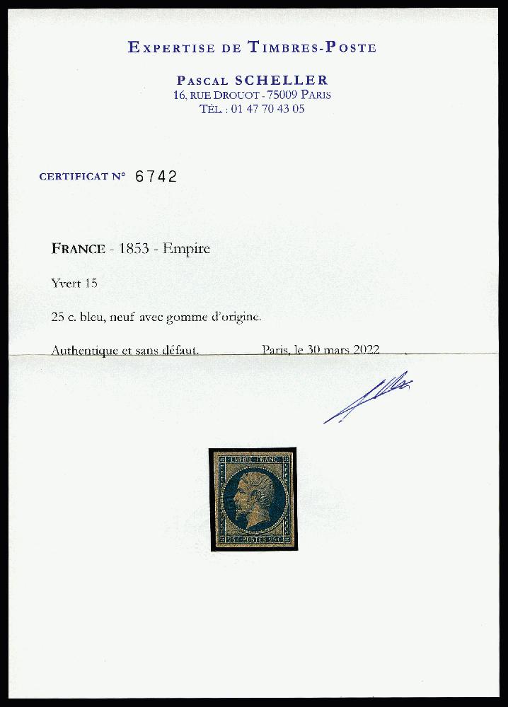 | Zusatzinformationen und Suchstichworte: | La Postale Philatélie 42. Auktion 7. Juli 2023 Los 150 Frankreich Empire ungezähnt 1853 N°15, 25c bleu, frais. SUP. R.R. (signé Calves/certificats) Qualité: * Cote: 3600 euros Ausruf 1.150,00 EUR |