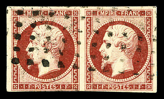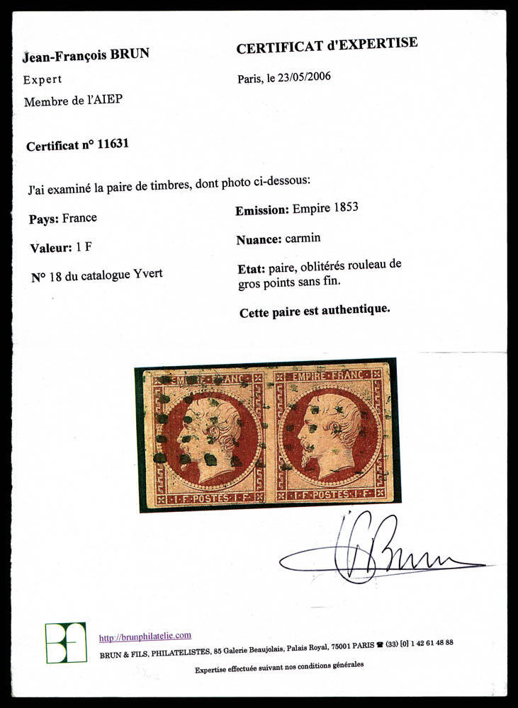 | Zusatzinformationen und Suchstichworte: | La Postale Philatélie 42. Auktion 7. Juli 2023 Los 179 Frankreich Empire ungezähnt 1853 N°18, 1F carmin en paire horizontale, oblitération gros points carrés, très jolie pièce, RARE (signé Brun/certificat) Qualité: Oblitéré Cote: 7750 euros Ausruf 1.900,00 EUR |