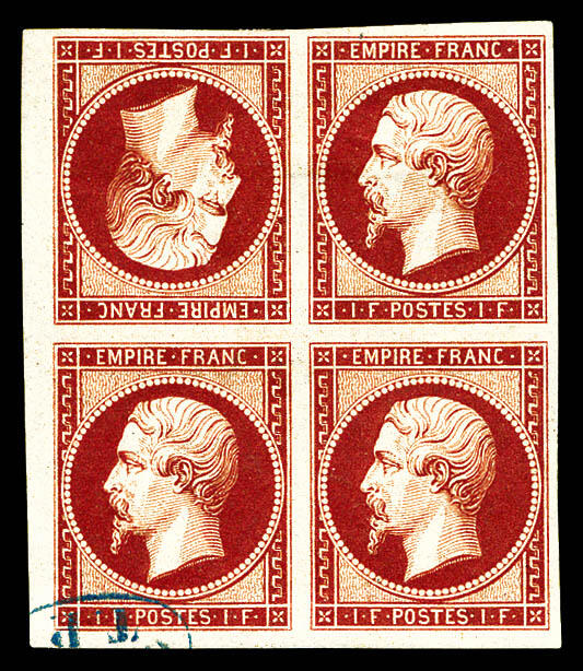 | Zusatzinformationen und Suchstichworte: | La Postale Philatélie 42. Auktion 7. Juli 2023 Los 189 Frankreich Empire ungezähnt 1853 N°18e, 1F carmin impression de 1862, TÊTE-BÊCHE tenant à normaux dans un bloc de quatre petit bord de feuille latéral, fraîcheur postale, PROBABLEMENT UNIQUE, GRANDE RARETE DE LA PHILATELIE FRANCAISE (certificats) Qualité: * Cote: 45000 euros Ausruf 19.000,00 EUR |