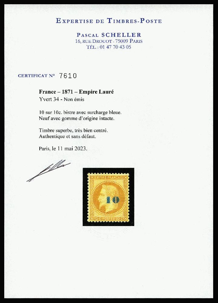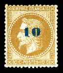 | Zusatzinformationen und Suchstichworte: | La Postale Philatélie 42. Auktion 7. Juli 2023 Los 298 Frankreich Empire gezähnt 1862 N°34, Non émis, 10c sur 10c bistre surcharge bleu-pâle, TTB (certificat) Qualité: * Cote: 3000 euros Ausruf 850,00 EUR |