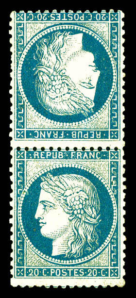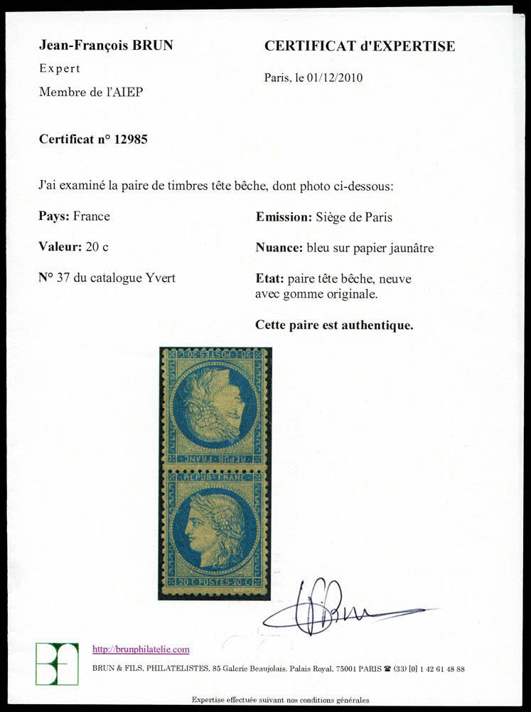 | Zusatzinformationen und Suchstichworte: | La Postale Philatélie 42. Auktion 7. Juli 2023 Los 316 Frankreich Ausgabe Siège de Paris 1870-71 N°37d, 20c bleu sur jaunâtre en paire tête-bêche verticale, gomme jaunie sinon TB (signé Brun/certificats) Qualité: * Cote: 7250 euros Ausruf 900,00 EUR |