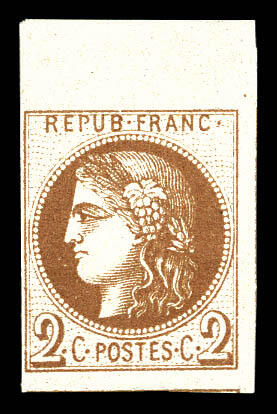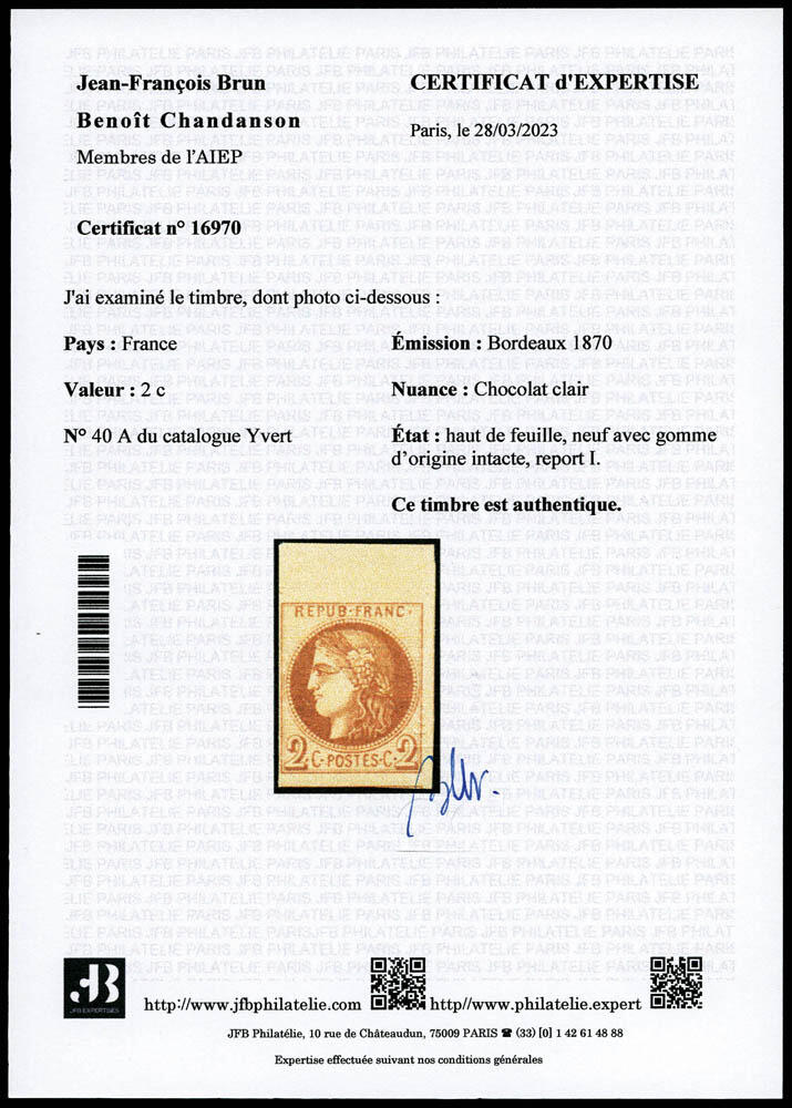 | Zusatzinformationen und Suchstichworte: | La Postale Philatélie 42. Auktion 7. Juli 2023 Los 359 Frankreich Ausgabe Bordeaux N°40A, 2c chocolat Report 1, haut de feuille, fraîcheur postale, SUPERBE (certificats) Qualité: ** Ausruf 1.300,00 EUR |
