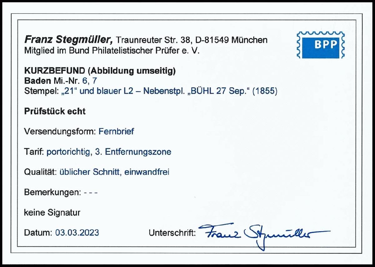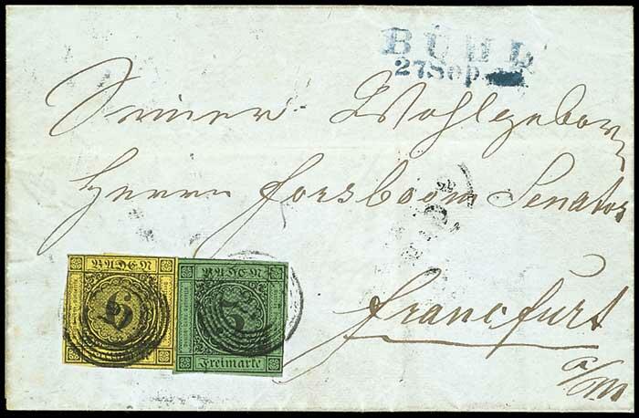 | Zusatzinformationen und Suchstichworte: | Dr. Reinhard Fischer 193. Auktion 21. - 22. Juli 2023 Los 8 Altdeutschland Baden 3 Kreuzer auf grün, zusammen mit 6 Kreuzer auf gelb auf portogerechtem Faltbrief von 5-Ring "21" - BÜHL 27. Sep (1855) (Nebenstempel in blau!) nach Frankfurt mit Bahnpost- und Distributionsstempel, üblicher Schnitt, sehr schön farbfrisch, horizontale Archivfaltung, mit vollem Inhalt, dekorative Buntfrankatur, neuer Fotobefund Stegmüller BPP (2023) "üblicher Schnitt, einwandfrei" Ausruf 100,00 EUR |