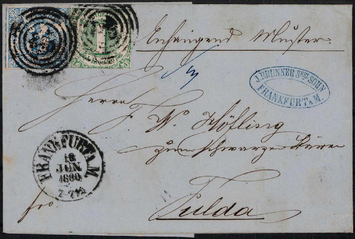 | Zusatzinformationen und Suchstichworte: | 203. Auktionshaus Schulz Auktion Los 4232 Altdeutschland Thurn und Taxis 3 Kr. blau und 1 Kr. grün auf Musterfaltbrief "ANHÄNGEND MUSTER" mit Nummernstempel "220" FRANKFURT 1860 nach Fulda, Befund Sem "echt, tarifrichtig frankiert" (Alter Ausrufpreis: 40 EUR) GEBOT |