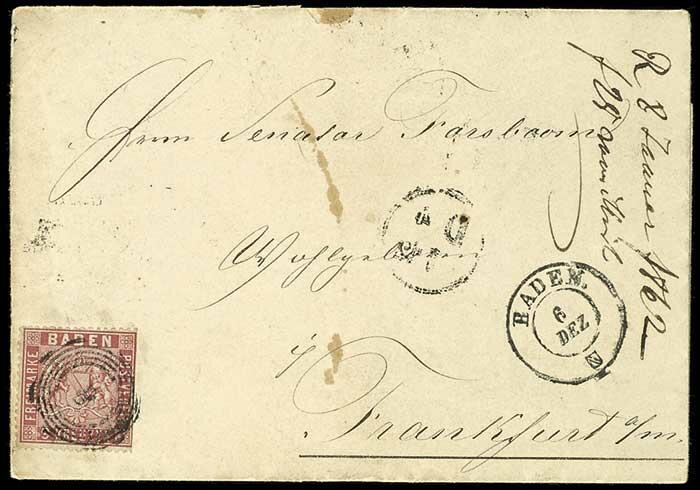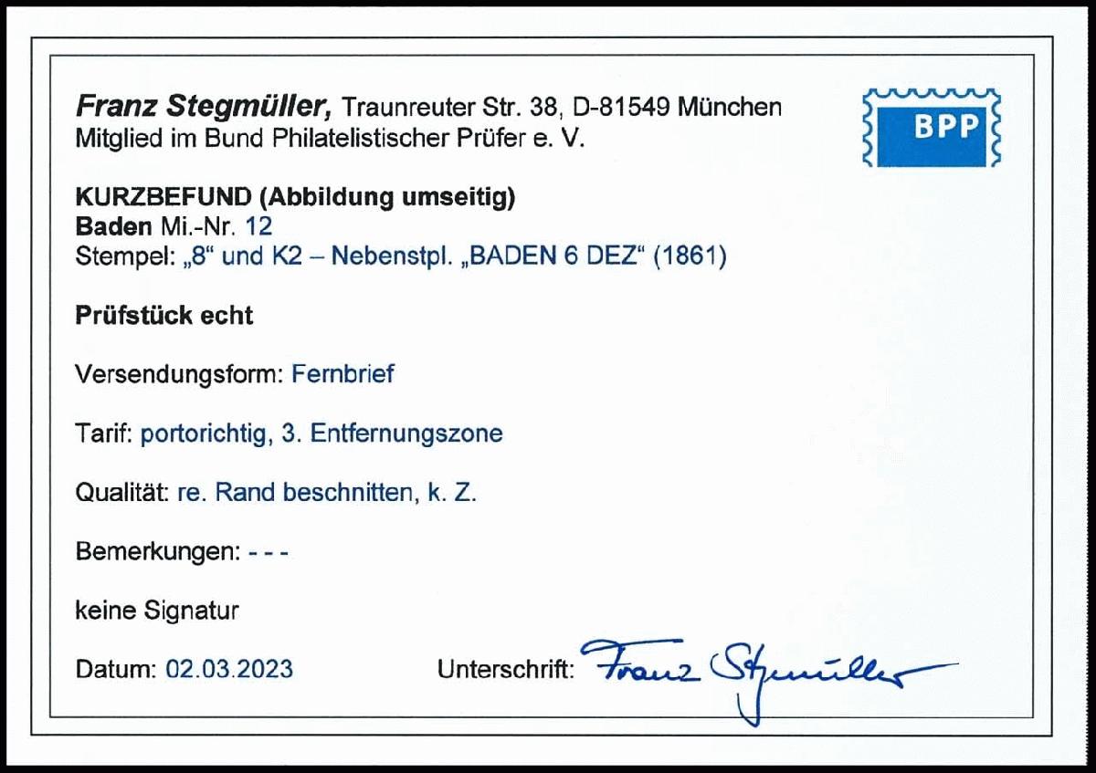 | Zusatzinformationen und Suchstichworte: | Dr. Reinhard Fischer 193. Auktion 21. - 22. Juli 2023 Los 16 Altdeutschland Baden 9 Kreuzer Wappen lebhaftrosarot, auf portogerechtem Faltbrief mit 5-Ring "8" - BADEN 6 DEZ. (1861) nach Frankfurt mit Bahnpost- und Distributionsstempel, rechter Rand der Marke mit Scherentrennung, sonst teils etwas flach gezähnt, sehr schön farbfrisch, Umschlag leichte Altersflecken, neuer Fotobefund Stegmüller BPP (2023), Mi. 600.- Ausruf 75,00 EUR |