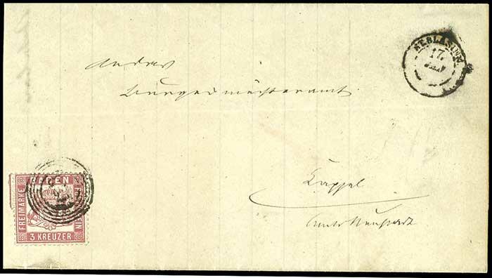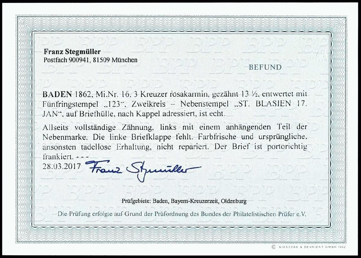 | Zusatzinformationen und Suchstichworte: | Dr. Reinhard Fischer 193. Auktion 21. - 22. Juli 2023 Los 20 Altdeutschland Baden 3 Kreuzer Wappen mittelrosarot, eng gezähnt, auf portogerechter Faltbriefhülle von 5-Ring "123" - ST. BLASIEN 17 JAN nach Kappel mit Ankunftsstempel von Lenzkirch, ringsum gut gezähnt, links sogar mit anhängendem Teil der Nebenmarke, tadellose Erhaltung, linke Briefklappe fehlend, Kabinett, Fotobefund Stegmüller BPP "Allseits vollständige Zähnung... [...] Farbfrische und ursprüngliche, tadellose Erhaltung, nicht repariert.", Mi. 650.- Ausruf 170,00 EUR |