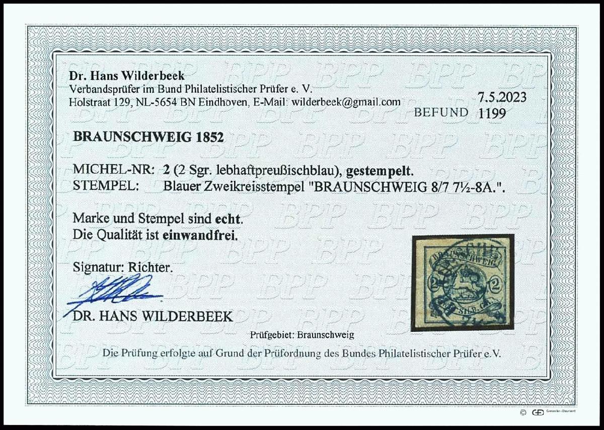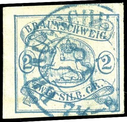| Zusatzinformationen und Suchstichworte: | Dr. Reinhard Fischer 193. Auktion 21. - 22. Juli 2023 Los 181 Altdeutschland Braunschweig 2 Silbergroschen lebhaftpreußischblau, breitrandig geschnittenes und farbfrisches Kabinettstück, entwertet mit Zweikreisstempel "Braunschweig 8/7 71/2-8A" in blau, Fotobefund Dr. Hans Wilderbeek BPP (2023): "Die Qualität ist einwandfrei.", Mi. 350.- Ausruf 100,00 EUR |