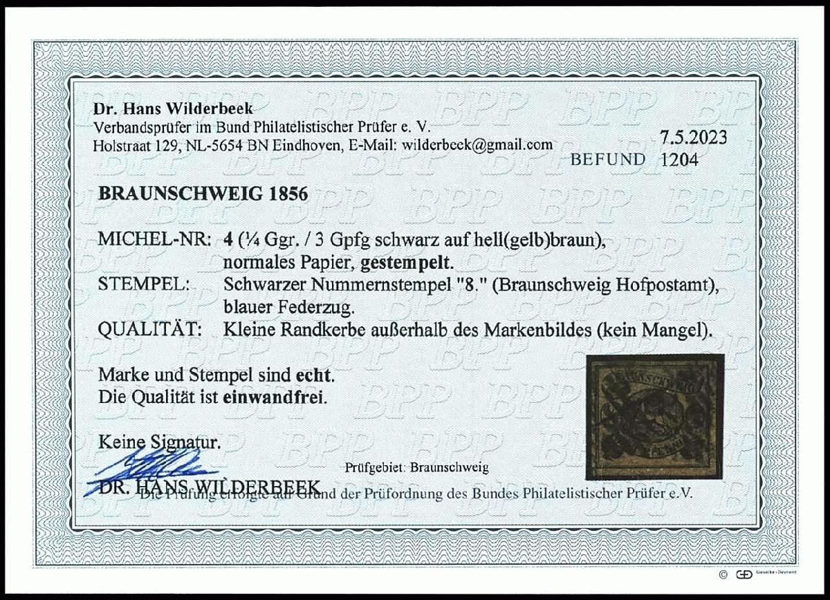 | Zusatzinformationen und Suchstichworte: | Dr. Reinhard Fischer 193. Auktion 21. - 22. Juli 2023 Los 184 Altdeutschland Braunschweig 4/4 Ggr. schwarz auf hellgelbbraun, vollrandig und farbfrisch, entwertet mit Nummernstempel "8." (Braunschweiger Hofpostamt) und blauem Federzug, kleine Randkerbe außerhalb des Markenbildes (kein Mangel), Fotobefund Dr. Hans Wilderbeek BPP (2023): "Die Qualität ist einwandfrei.", Mi. 320.- Ausruf 80,00 EUR |