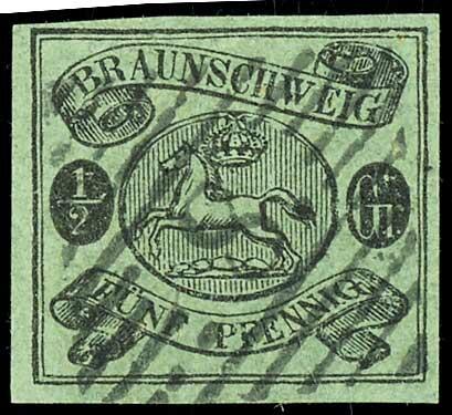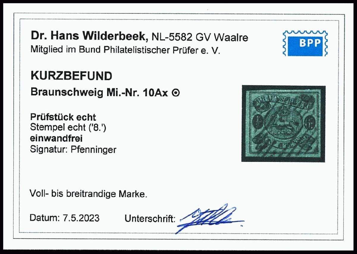 | Zusatzinformationen und Suchstichworte: | Dr. Reinhard Fischer 193. Auktion 21. - 22. Juli 2023 Los 193 Altdeutschland Braunschweig 1/2 Groschen schwarz auf lebhaftgraugrün, dünnes Papier, vollrandiges und farbfrisches Kabinettstück, entwertet mit Nummernstempel "8.", gepr. Pfenninger und Fotobefund Dr. Hans Wilderbeek BPP (2023):: "echt und einwandfrei", Mi. 300.- Ausruf 80,00 EUR |