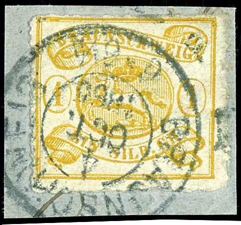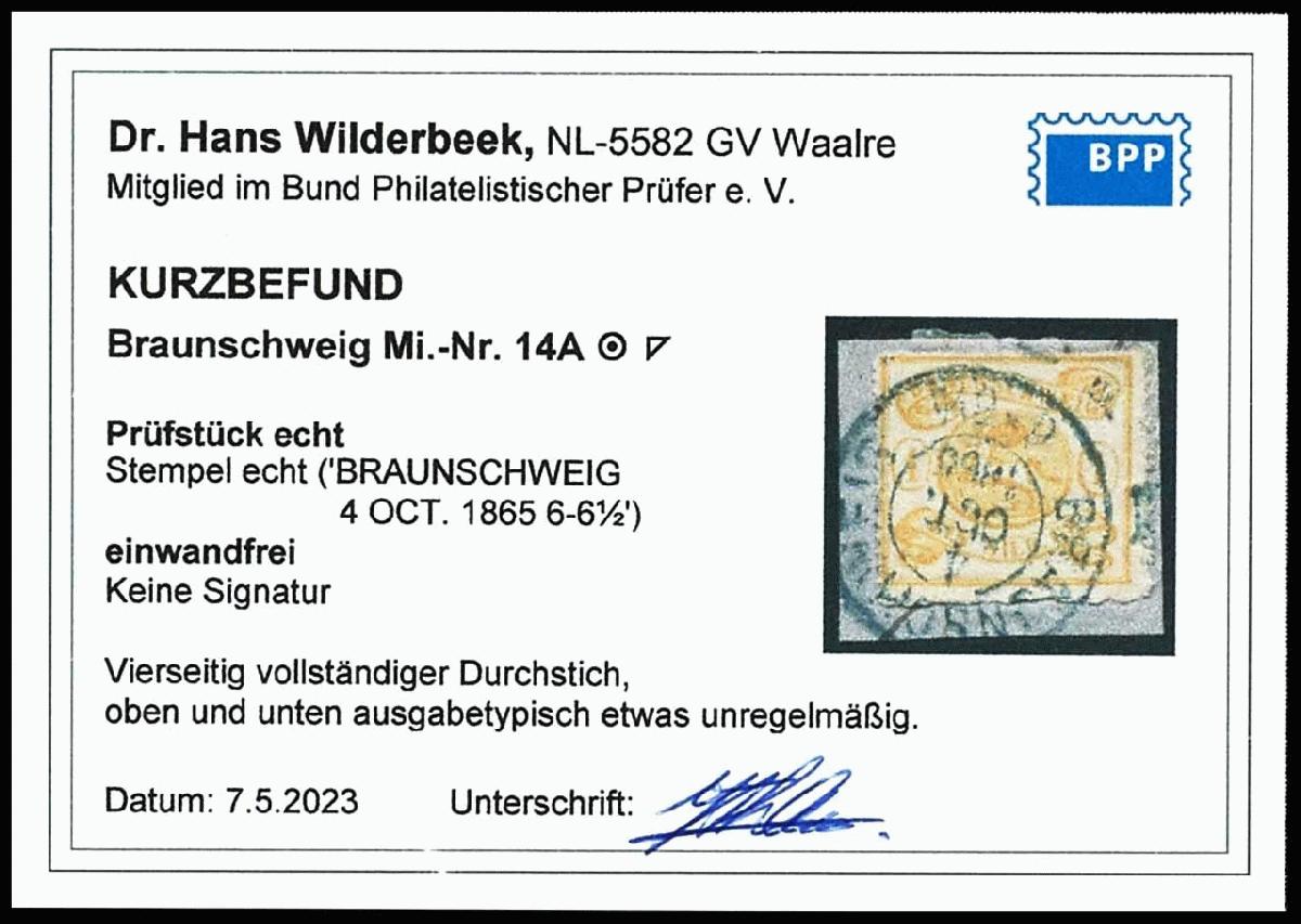 | Zusatzinformationen und Suchstichworte: | Dr. Reinhard Fischer 193. Auktion 21. - 22. Juli 2023 Los 202 Altdeutschland Braunschweig 1 Silbergroschen lebhaftgelbocker, bogenförmig durchstochen 16, entwertet mit blauem K2 "Braunschweig 4 Oct. 1866" auf Briefstück, tadellos, Fotobefund Dr. Hans Wilderbeek BPP (2023): "echt und einwandfrei", Mi. 180.- Ausruf 50,00 EUR |