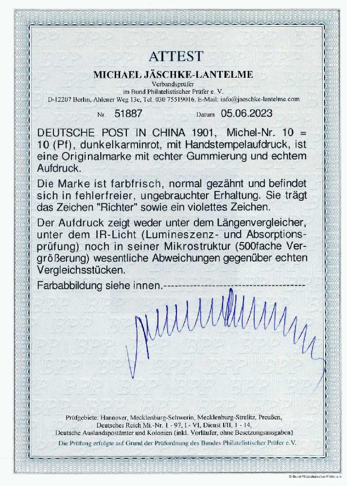 | Zusatzinformationen und Suchstichworte: | Auktionshaus Weiser 775. Auktion 7. - 8. Juli 2023 Los 1055 Deutsche Auslandspost China Deutsche Auslandspost / China / 1900, 10 Pfg. Handstempelaufdruck, ungebraucht Pracht (winziges Haftstellchen - fast postfrisch), neues Foto-Attest Jäschke-Lantelme BPP (ungebr., Mi.-Nr. 10, Mi.EUR 1.200,--) Zuschlag 610,00 EUR |