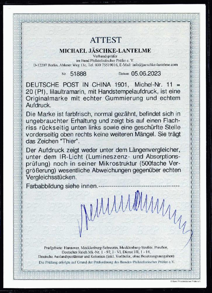 | Zusatzinformationen und Suchstichworte: | Auktionshaus Weiser 775. Auktion 7. - 8. Juli 2023 Los 1056 s Deutsche Auslandspost China Deutsche Auslandspost / China / 1900, 20 Pfg. Handstempelaufdruck, ungebraucht Pracht, punktförmiges Schürfstellchen, neues Foto-Attest Jäschke-Lantelme BPP (ungebr., Mi.-Nr. 11, Mi.EUR 1.000,--) Zuschlag 200,00 EUR |