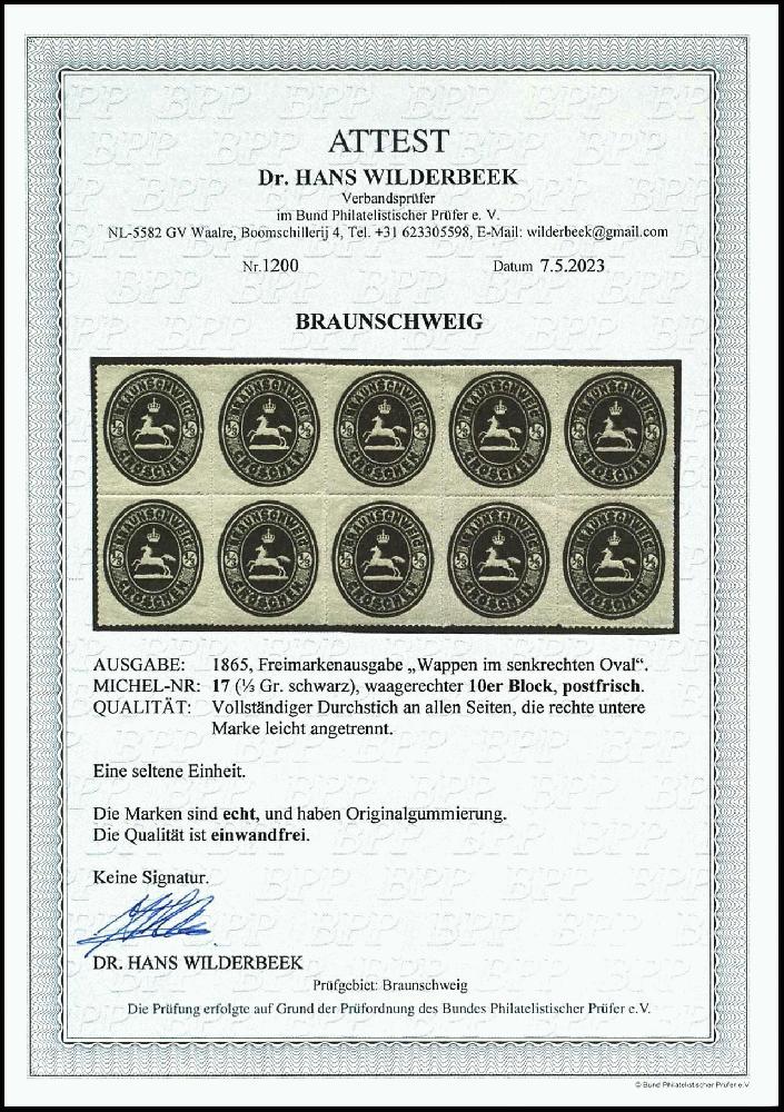 | Zusatzinformationen und Suchstichworte: | Dr. Reinhard Fischer 193. Auktion 21. - 22. Juli 2023 Los 206 Altdeutschland Braunschweig 1/3 Groschen schwarz, Zehnerblock mit allseits gutem Durchstich in farbfrisches Kabinetterhaltung, die rechte untere Marke leicht angetrennt (der Ordnung halber erwähnt), unsigniert - wie gestern am Postschalter gekauft, Fotoattest Dr. Hans Wilderbeek BPP (2023): "Eine seltene Einheit. Die Qualität ist einwandfrei." Ausruf 250,00 EUR |