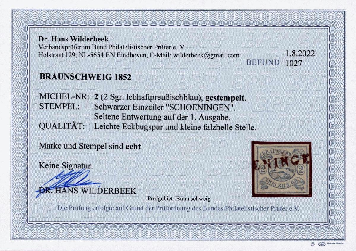 | Zusatzinformationen und Suchstichworte: | 32. Schlegel Auktionshaus Auktion 15. - 19. Mai 2023 Los 5151 Altdeutschland Braunschweig 1852, 2 Sgr. lebhaftpreußischblau mit Einzeiler Schoeningen. Leichte Eckbugspur und kleine falzhelle Stelle, sonst ohne weitere Beanstandungen, mit seltener Entwertung auf der 1. Ausgabe. Fotobefund Dr. Wilderbeek BPP 08/2022 Zuschlag 81,00 EUR |