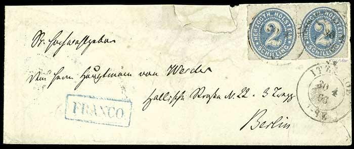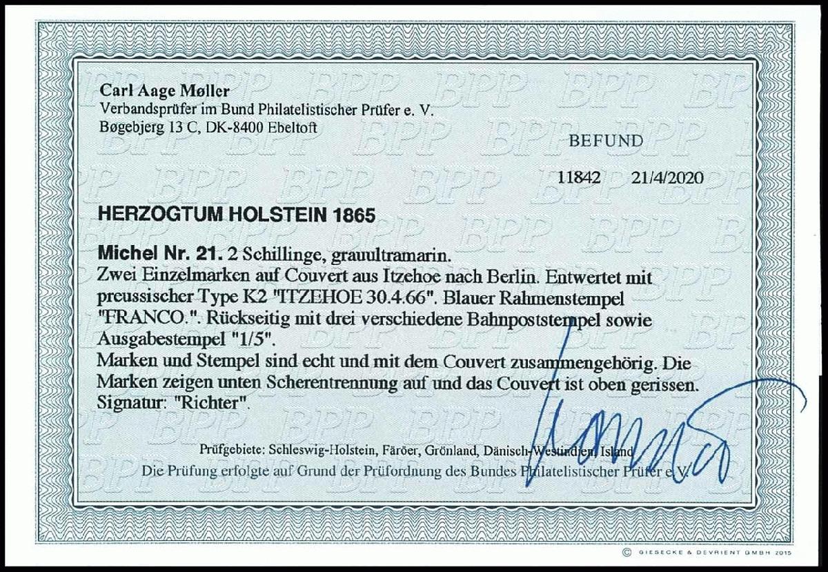 | Zusatzinformationen und Suchstichworte: | Dr. Reinhard Fischer 193. Auktion 21. - 22. Juli 2023 Los 760 Altdeutschland Schleswig Holstein 2 Schillinge grauultramarin, zwei Werte auf Brief von "ITZEHOE 30 4 66" nach Berlin, nebengesetzt blauer Ra1 "Franco", rückseitig drei verschiedene Bahnpoststempel sowie Ausgabestempel vom 1.5, Frankatur Scherentrennung, Umschlag oben mit Ausriss, gepr Ausruf 30,00 EUR |