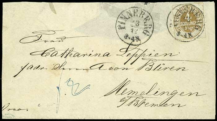 | Zusatzinformationen und Suchstichworte: | Dr. Reinhard Fischer 193. Auktion 21. - 22. Juli 2023 Los 761 Altdeutschland Schleswig Holstein 4 Schillinge braunocker, Einzelfrankatur auf Couvert von "PINNEBERG 13 12" nach Hemelingen mit Ankunftsstempel vom 14.12, Durchgangsstempel "Hamburg 13.12.66" rückseitig abgeschlagen, der Umschlag ist rückseitig mangelhaft und mit Tesafilm gestützt, die Marke hat einen Riss Ausruf 100,00 EUR |