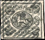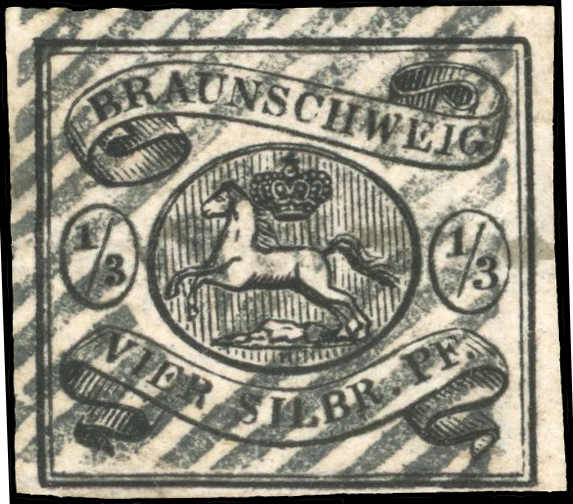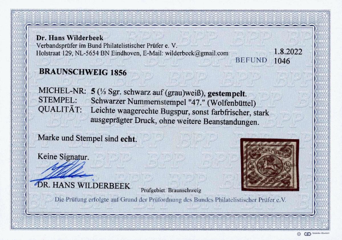 | Zusatzinformationen und Suchstichworte: | 32. Schlegel Auktionshaus Auktion 15. - 19. Mai 2023 Los 5156 Altdeutschland Braunschweig 1856, 1/3 Sgr. schwarz auf (grau)weiß mit Nummernstempel "47." (Wolfenbüttel). Leichte waagerechte Bugspur, sonst farbfrischer, stark ausgeprägter, rückseitig erscheinender Druck. Unsigniert, Fotobefund Dr. Wilderbeek BPP 08/2022 Ausruf 90,00 EUR |