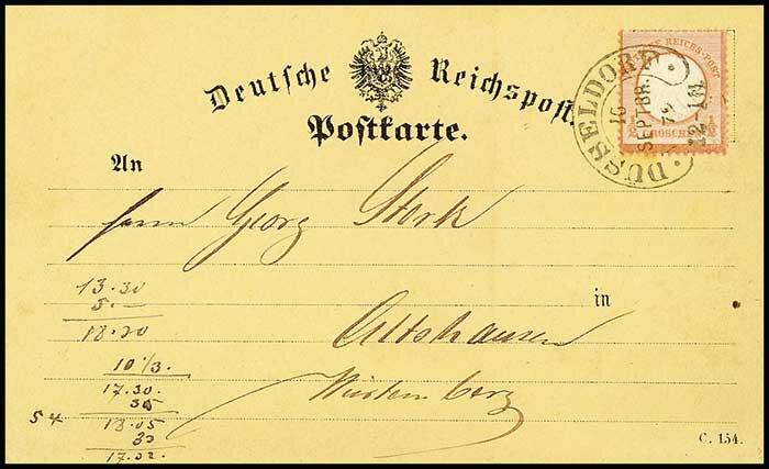 | Zusatzinformationen und Suchstichworte: | Dr. Reinhard Fischer 193. Auktion 21. - 22. Juli 2023 Los 1189 Deutsches Reich "DÜSSELDORF 16 SEPTBR 72" - klar auf 1/2 Groschen rötlichorange, kleiner Schild auf amtlichen Postkartenformular (Frech Nr. 27) nach Althausen, Fotobefund Krug BPP: "in einwandfreier Erhaltung.", (Spalink 11-1N2) Ausruf 80,00 EUR |