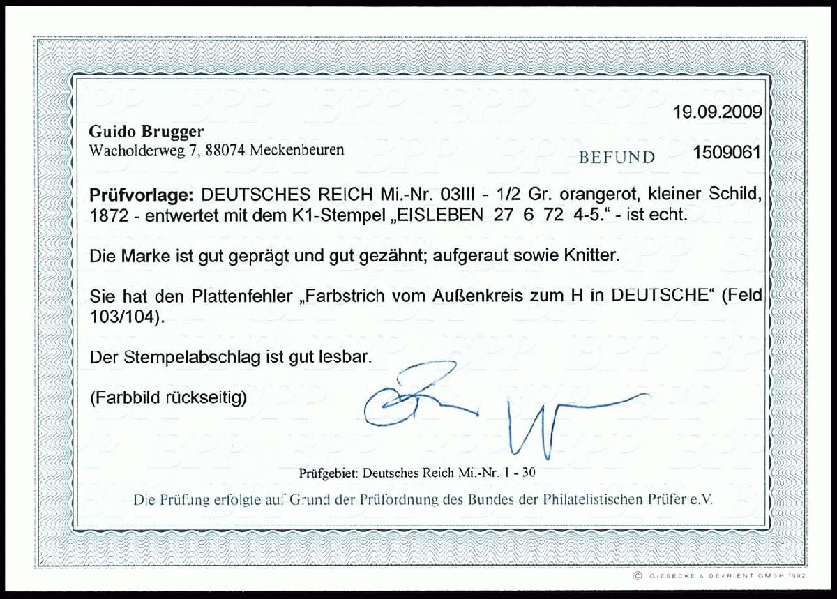 | Zusatzinformationen und Suchstichworte: | Dr. Reinhard Fischer 193. Auktion 21. - 22. Juli 2023 Los 1300 Deutsches Reich, 1872 Kleiner Brustschild 1/2 Groschen kleiner Schild, orangerot, Plattenfehler III "Farbfrisch vom Außenkreis zum H in Deutsche" (Feld 103/104), entwertet mit K1 "Eisleben 27 6 72", Marke aufgeraut und Knitter, Fotobefund Brugger BPP Ausruf 40,00 EUR |