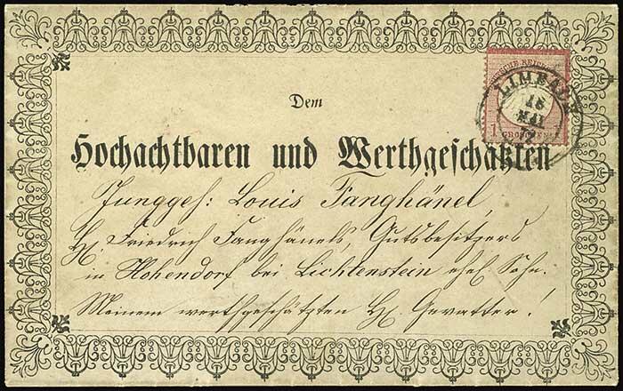 | Zusatzinformationen und Suchstichworte: | Dr. Reinhard Fischer 193. Auktion 21. - 22. Juli 2023 Los 1305 Deutsches Reich, 1872 Kleiner Brustschild 1 Gr. kleiner Schild als Einzelfrankatur auf tadellos erhaltenem Taufpaten-Zierbrief aus Limbach nach Hohendorf bei Lichtenstein. Aufgeschlagen enthält der Brief die Abbildung der Taufkirche in Pleißa mit der gedruckten Einladung, die Vorderseite des Umschlags ist reich verziert, tarifgerechte Frankatur, Laut Fotoattest Brugger BPP (2009) farbfrisch und gut geprägt, Zahnfehler (eher ein paar stumpfe Zähne), Beleg in dieser Form sicher sehr selten. Ausruf 1.200,00 EUR |