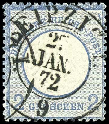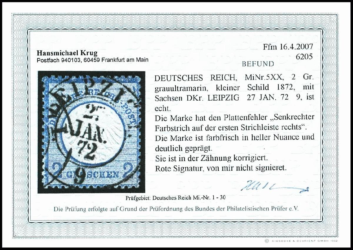 | Zusatzinformationen und Suchstichworte: | Dr. Reinhard Fischer 193. Auktion 21. - 22. Juli 2023 Los 1325 Deutsches Reich, 1872 Kleiner Brustschild 2 Groschen kleiner Schild, grauultramarin, Plattenfehler XX "senkrechter Farbstrich auf der ersten Strichelleiste rechts", zentrisch entwertet mit sächsischem Doppelkreisstempel "Leipzig 27. Jan 72" (erster Verwendungsmonat der Marken), in der Zähnung korrigiert, Fotobefund Krug BPP Ausruf 30,00 EUR |