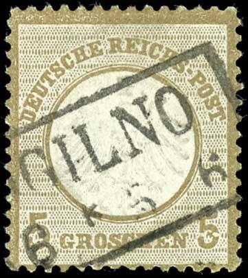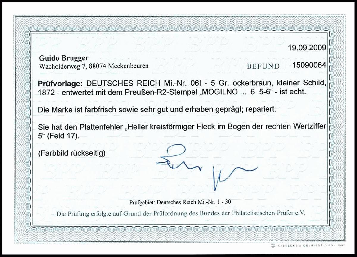 | Zusatzinformationen und Suchstichworte: | Dr. Reinhard Fischer 193. Auktion 21. - 22. Juli 2023 Los 1328 Deutsches Reich, 1872 Kleiner Brustschild 5 Groschen kleiner Schild, ockerbraun, Plattenfehler I "Heller kreisförmiger Fleck im Bogen der rechten Wertziffer 5" (Feld 17), entwertet mit preußischem Ra2 "Mogilno", repariert - optisch ansprechendes Stück - Plattenfehler schön sichtbar, Fotobefund Brugger BPP, Mi. 300.- Ausruf 30,00 EUR |