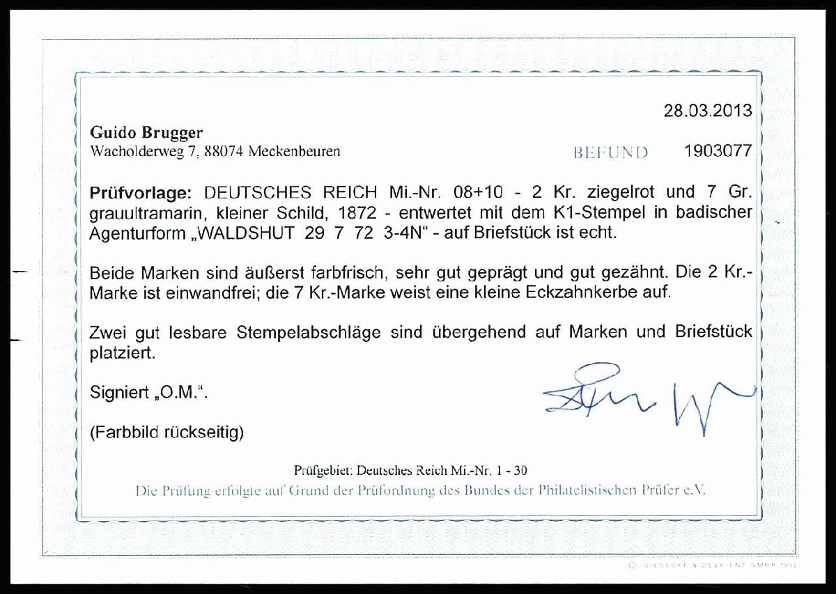 | Zusatzinformationen und Suchstichworte: | Dr. Reinhard Fischer 193. Auktion 21. - 22. Juli 2023 Los 1335 Deutsches Reich, 1872 Kleiner Brustschild 2 Kreuzer kleiner Schild, ziegelrot und 7 kr. grauultramarin mit K 1 in badischer Agenturform "WALDSHUT 29.7.72" auf Briefstück, 7 Kr. kleine Eckzahnkerbe, sonst tadellos, Fotobefund Brugger BPP Ausruf 100,00 EUR |