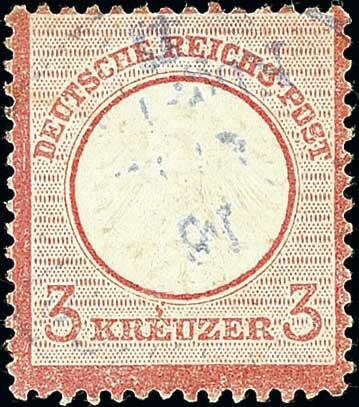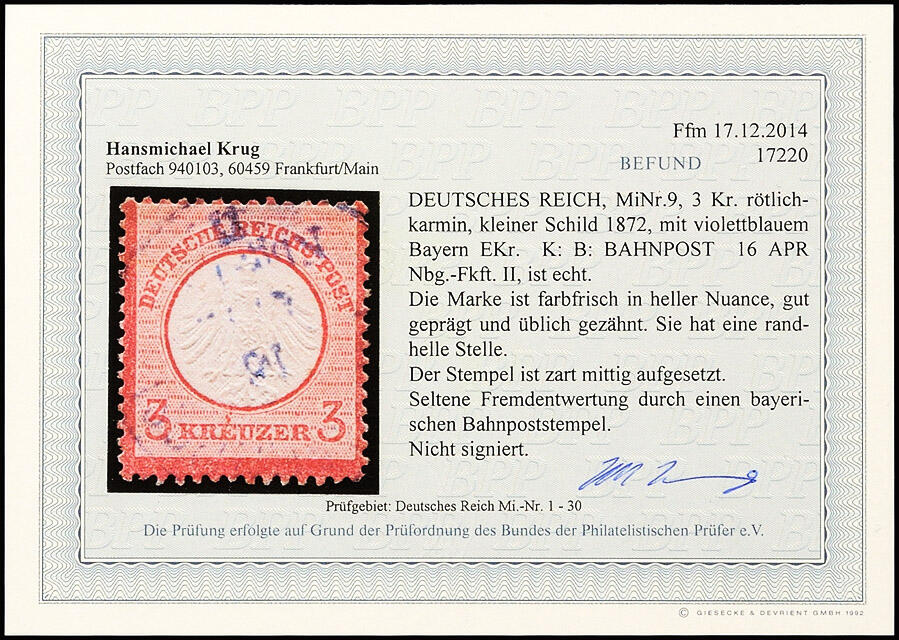 | Zusatzinformationen und Suchstichworte: | Dr. Reinhard Fischer 193. Auktion 21. - 22. Juli 2023 Los 1337 Deutsches Reich, 1872 Kleiner Brustschild 3 Kr. rötlichkarmin, farbfrische, gut geprägte Marke in heller Nuance, zentrischer, zart mittig aufgesetzter violettblauer bayerischer Bahnpost-K1 "K: B: BAHNPOST 16 APR Nbg.-Fkft. II". Randhelle Stelle, sonst einwandfrei. Fotobefund Krug BPP (2014) "Seltene Fremdentwertung durch einen bayerischen Bahnpoststempel." Ausruf 80,00 EUR |