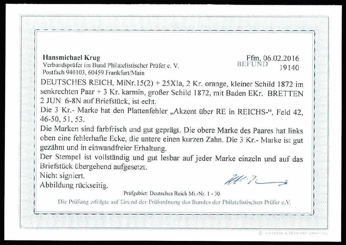 | Zusatzinformationen und Suchstichworte: | Dr. Reinhard Fischer 193. Auktion 21. - 22. Juli 2023 Los 1356 Deutsches Reich, 1872 Grosser Brustschild 2 Kreuzer kleiner Schild, orange, senkrechtes Paar und 3 Kr. großer Schild, karmin mit Plattenfehler "Akzent über RE und REICHS" mit Baden Ekr. "BRETTEN 2 JUN" auf Briefstück, die obere Marke des Paares hat links oben eine fehlerhafte Ecke, die untere einen kurzen Zahn, Fotobefund Krug BPP Ausruf 100,00 EUR |