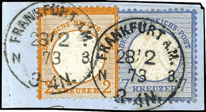 | Zusatzinformationen und Suchstichworte: | Dr. Reinhard Fischer 193. Auktion 21. - 22. Juli 2023 Los 1357 Deutsches Reich, 1872 Kleiner Brustschild 2 Kreuzer kleiner Schild, orange und 7 Kr. kleiner Schild, grauultramarin mit Ekr. "FRANKFURT 28/2 73" auf Briefstück, tadellos, Fotoattest Brugger BPP Ausruf 100,00 EUR |
