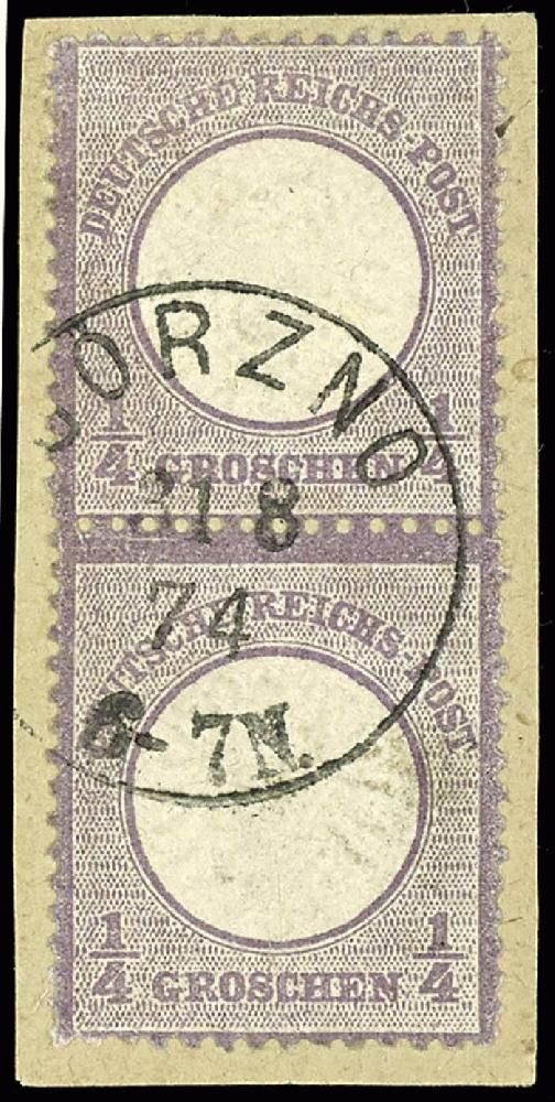 | Zusatzinformationen und Suchstichworte: | Dr. Reinhard Fischer 193. Auktion 21. - 22. Juli 2023 Los 1365 Deutsches Reich, 1872 Grosser Brustschild 1/4 Groschen grauviolett, großer Schild, farbfrisches senkrechtes Paar, entwertet mit NDP Einkreisstempel "Gorzno 31 8 74 6-7N" auf Briefstück, tadellose Erhaltung, senkrechte Paare sind seltener als waagerechte, Fotobefund Krug BPP (2020): "gut gezähnt und in einwandfreier Erhaltung.", Mi. 300.-+ Ausruf 120,00 EUR |