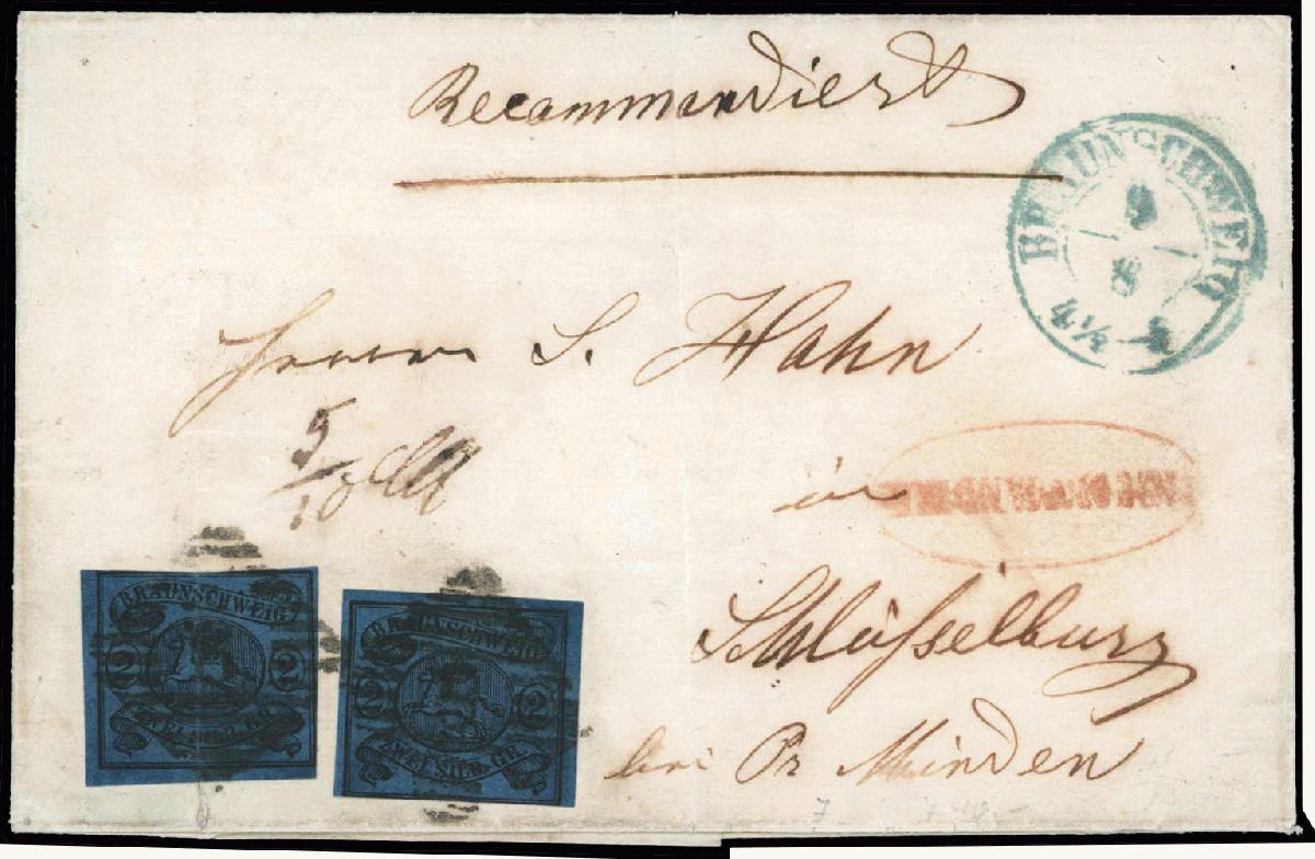 | Zusatzinformationen und Suchstichworte: | 32. Schlegel Auktionshaus Auktion 15. - 19. Mai 2023 Los 5161 Altdeutschland Braunschweig 1853, 2 Sgr. schwarz auf blau, 2 Einzelexemplare als Mehrfachfrankatur auf tarifgemäß frankierter recommandierter Faltbriefhülle von Braunschweig 9.8.1857 nach Schlüsselburg. Schwarzer Nummernstempel "8." auf den Marken. Linke Marke mit senkrechter Bugspur, oben und minimal rechts berührt, sonst zweiseitig breitrandig. Die rechte Marke unten berührt, sonst dreiseitig breitrandig. Der Brief mit leichten Reinigungsspuren. Recommandierte Briefe wurden im Herzogtum nur wenig verschickt. Fotoattest Dr. Wilderbeek BPP 08/2022 Ausruf 140,00 EUR |