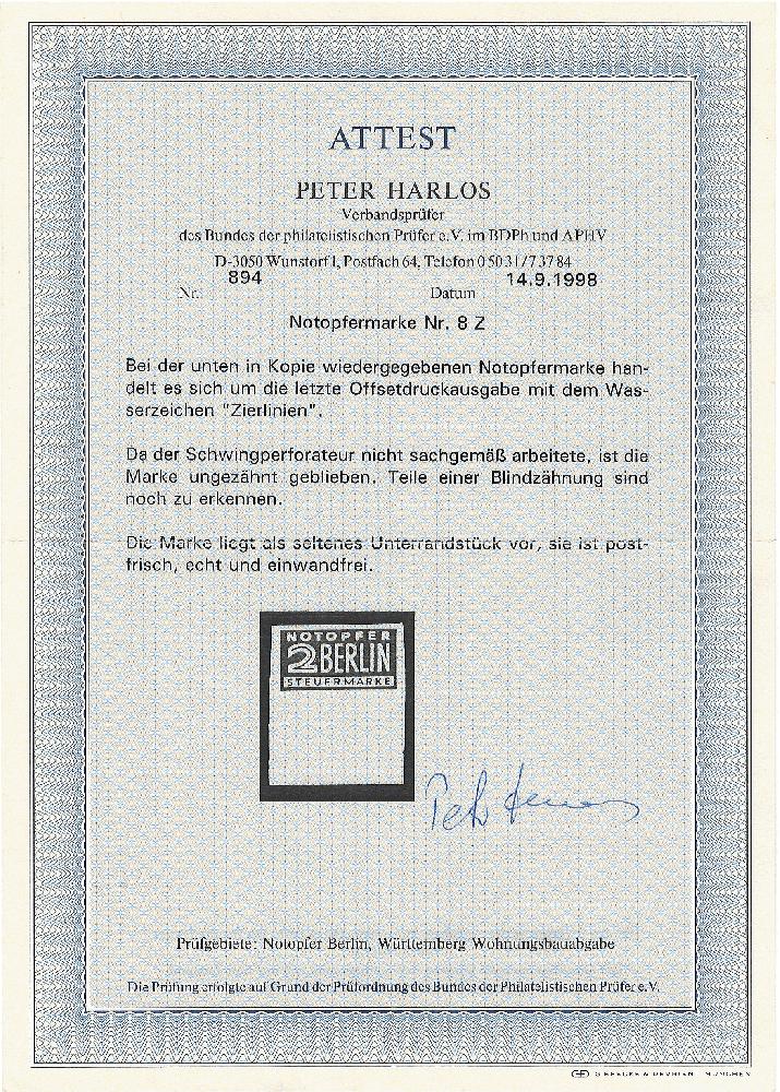 | Zusatzinformationen und Suchstichworte: | Notopfer Nr. 8 Z ungezähnt |