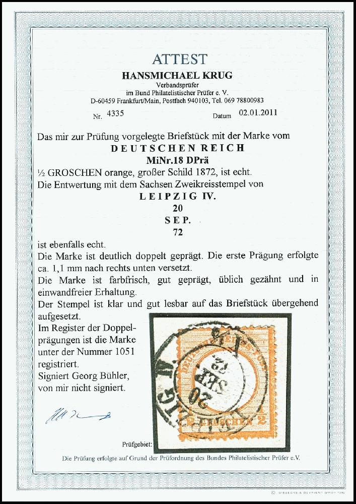 | Zusatzinformationen und Suchstichworte: | Dr. Reinhard Fischer 193. Auktion 21. - 22. Juli 2023 Los 1384 Deutsches Reich, 1872 Grosser Brustschild 1/2 Groschen großer Schild, orange, Abart "Doppelprägung" - die erste Prägung erfolgte ca. 1,1 mm nach rechts unten versetzt, entwertet mit Sachsen-Zweikreisstempel "Leipzig IV. 20 Sep. 72" auf Briefstück, tadellose Kabinetterhaltung, im Register der Doppelprägungen unter Nr. 1051 eingetragen, Fotoattest Krug BPP: "Die Marke ist farbfrisch, gut geprägt, üblich gezähnt und in einwandfreier Erhaltung.", Mi. 600.- Ausruf 180,00 EUR |