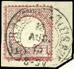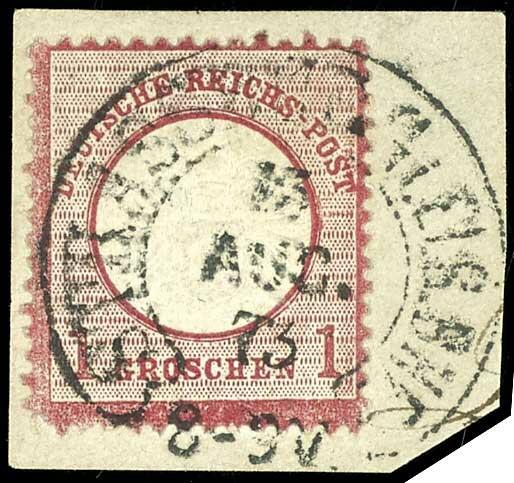 | Zusatzinformationen und Suchstichworte: | Dr. Reinhard Fischer 193. Auktion 21. - 22. Juli 2023 Los 1395 Deutsches Reich 1 Groschen großer Schild, karmin, Besonderheit: "um 2,5 Millimeter nach unten versetzte Prägung", entwertet mit Hufeisenstempel "Straßburg i. Els. Bhf. 15. Aug 73" (Spalink 36-2) auf Briefstück, Fotobefund Krug BPP: "Die Marke ist farbfrisch, gut geprägt, üblich gezähnt und in einwandfreier Erhaltung." Ausruf 50,00 EUR |