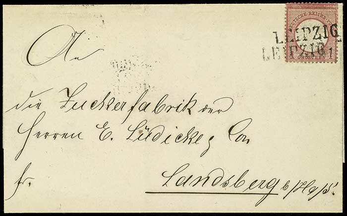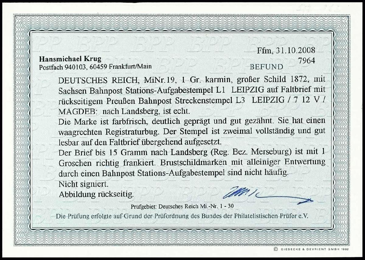 | Zusatzinformationen und Suchstichworte: | Dr. Reinhard Fischer 193. Auktion 21. - 22. Juli 2023 Los 1397 Deutsches Reich, 1872 Grosser Brustschild 1 Groschen karmin, großer Schild, Einzelfrankatur auf Brief mit Stationsaufgabestempel L1 "Leipzig", adressiert nach Landsberg im Reg.-Bez. Merseburg, Fotobefund Hansmichael Krug BPP: "Brustschildmarken mit alleiniger Entwertung durch einen Bahnpost Stations-Aufgabestempel sind nicht häufig." Ausruf 40,00 EUR |